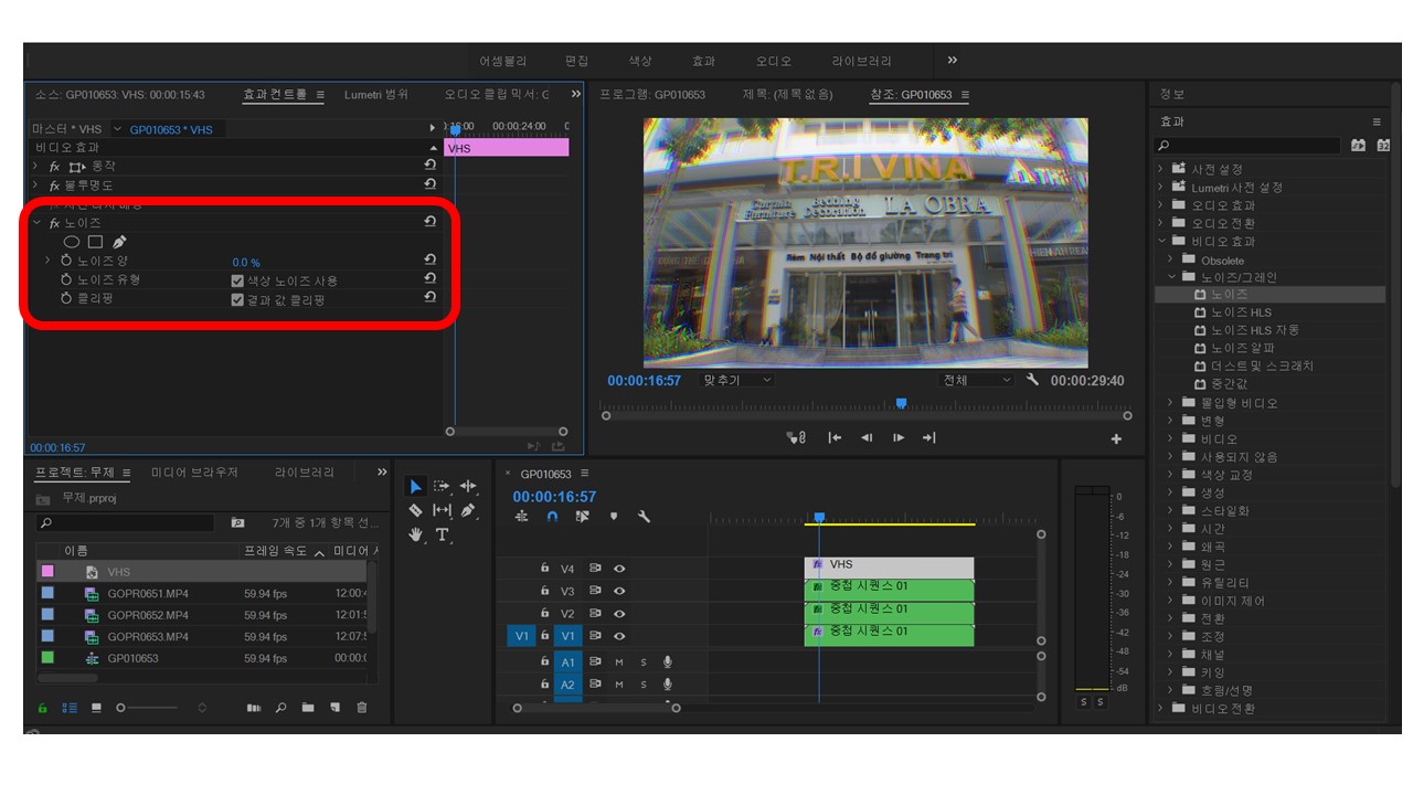 VHS 레이어를 누르고 효과컨트롤을 클릭하면 노이즈 효과가 입혀진 것을 볼 수 있습니다.