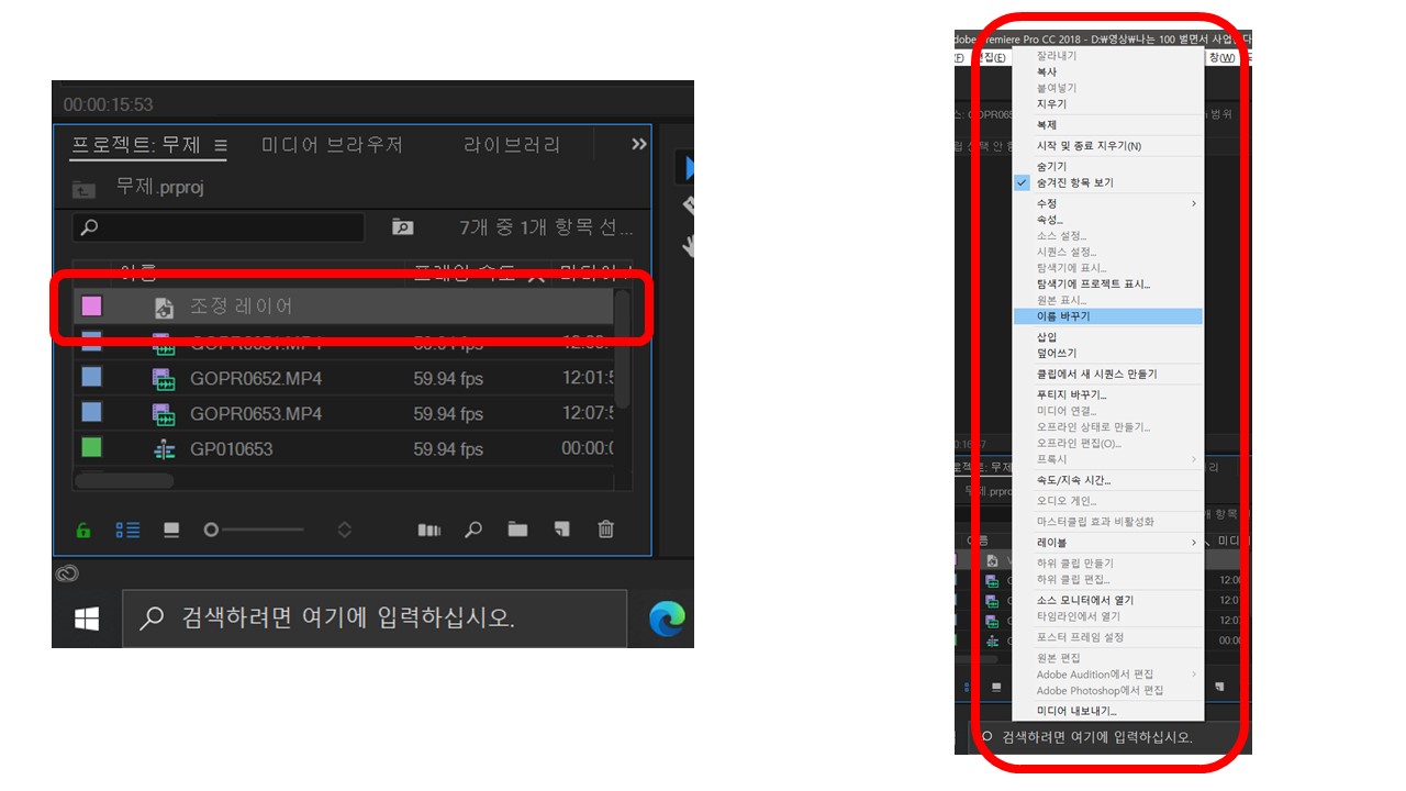 1. 프로젝트 안 박스중 빈 공간에서 마우스 오른쪽 버튼 -> 새 항목 -> 조정레이어